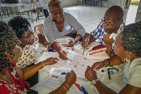 Participants at the Pastors and Disasters training workshop in Grenada carry out a mapping exercise from a the toolkit resource.Photo Credit: Janice Proud / Anglican Alliance