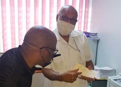 Archbishop Gregory shows the vaccinated area on his arm to Rev. Craig Mears, Director of Youth Ministries and Mrs Jacqueline Mighty, Diocesan Secretary. Below